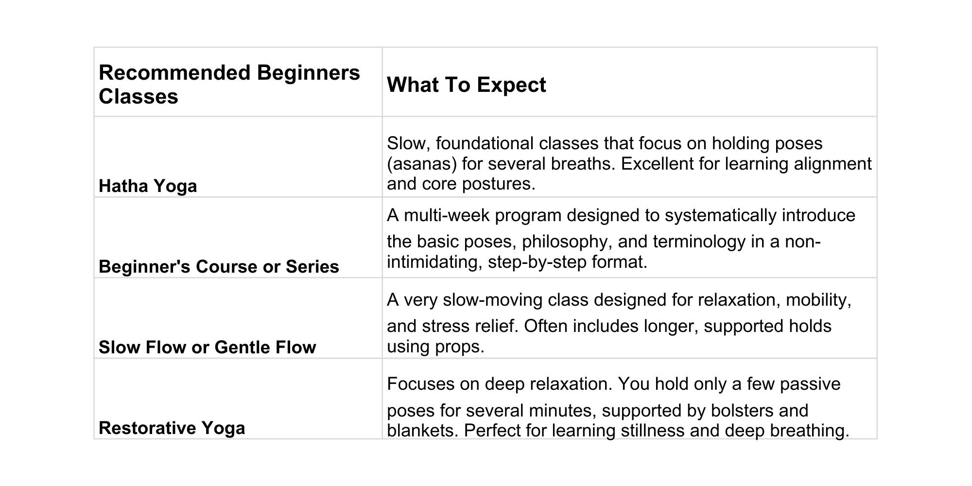 Tip: If the class title includes terms like "Power," "Hot," "Ashtanga," or "Vinyasa," it's generally best to wait until you have a few months of foundational practice before attending.
